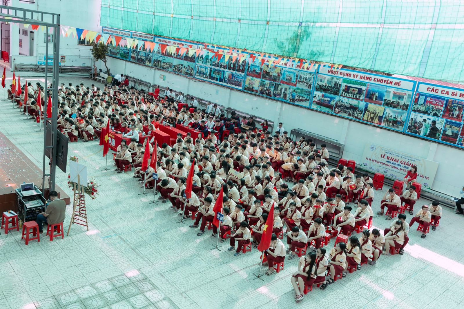 Mở đầu chương trình với các tiết mục văn nghệ đặc sắc, tiếp nối là nghi thức chào đón học sinh đầu cấp đầy trang trọng và ấm áp. Đúng 8h00, toàn thể đại biểu, Thầy Cô và Học Sinh cùng hướng về màn hình để dự Lễ Khai giảng toàn quốc - sự kiện gắn liền với chặng đường 80 năm vẻ vang của ngành giáo dục Việt Nam.